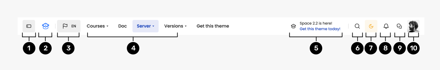 <figure><img src="https://1467436830-files.gitbook.io/~/files/v0/b/gitbook-x-prod.appspot.com/o/spaces%2FzE3nwrT9Zh3l0SGFdHp9%2Fuploads%2FuA2uOg4LGxZhu3MQ9j0y%2Ftopbar-space.jpg?alt=media&#x26;token=3870f678-5f46-4222-9c51-99d2b1b32ad1" alt=""><figcaption><p>Top bar explanation for logged-in users</p></figcaption></figure>