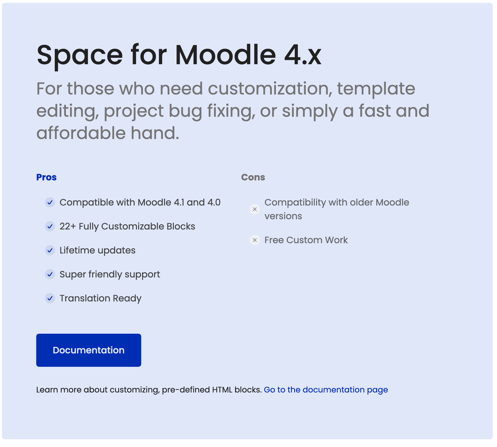 <p class="text-size-sm">Learn more about customizing, pre-defined HTML blocks. <a href="https://rosea.gitbook.io/space-moodle-theme/theme-settings/front-page-blocks" target="_blank" class="underline--anim">Go to the documentation page</a></p>